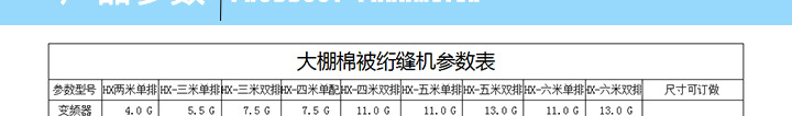 產(chǎn)品簡介:安徽省蕭縣徽星機械制造有限公司,已突破技術上的限制,獨立研發(fā)生產(chǎn)6米-8米型大棚被生產(chǎn)設備,領先國內同行棉被機器制造業(yè)縫制的寬度水平,在全國絕無第二家的大棚被生產(chǎn)設備,動力選用三項雙電機驅動,轉速可達140針/分鐘進行縫合,針距可調整到1-4公分,縫紉厚度可達到3-5公分,每平方米重量達8公斤。