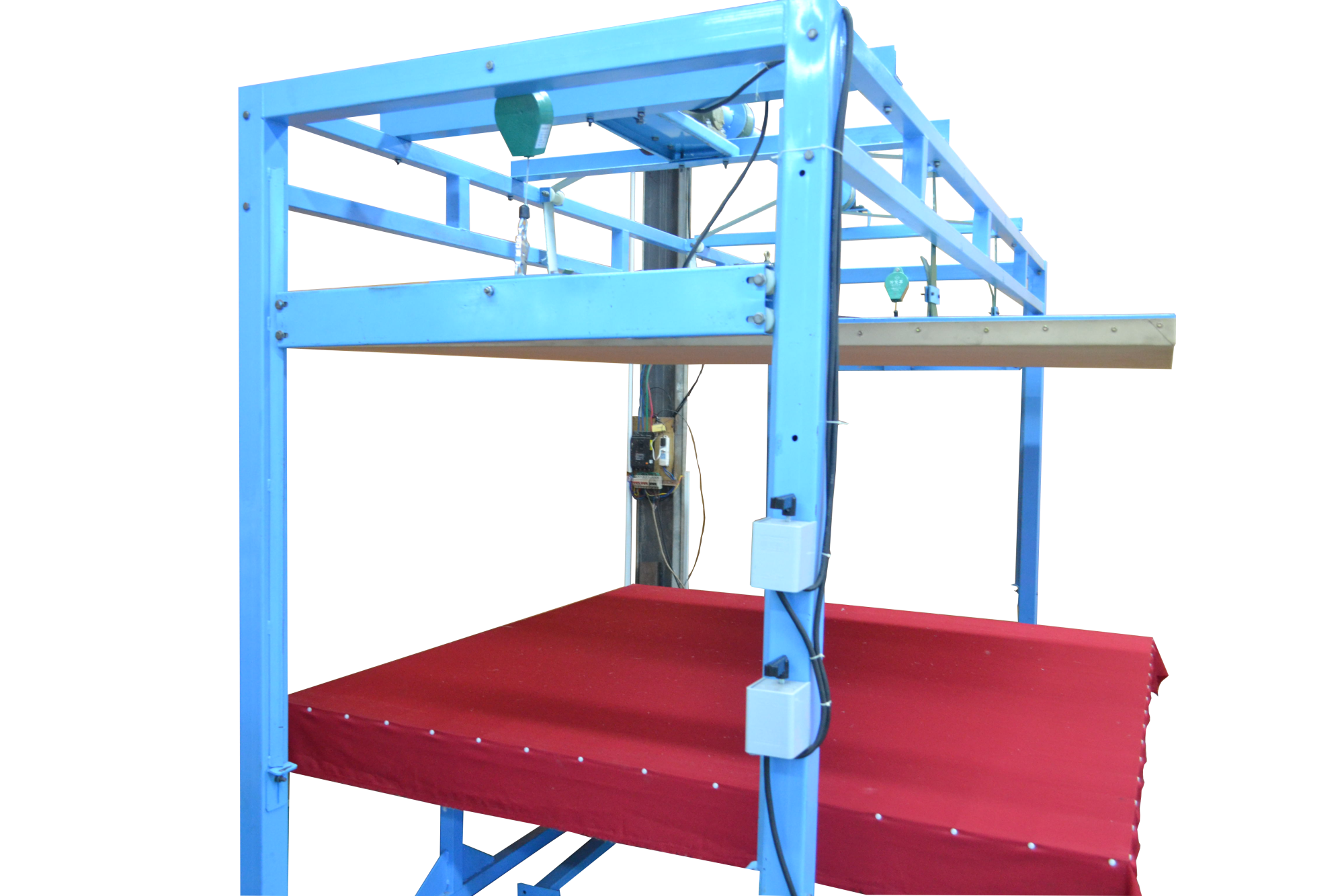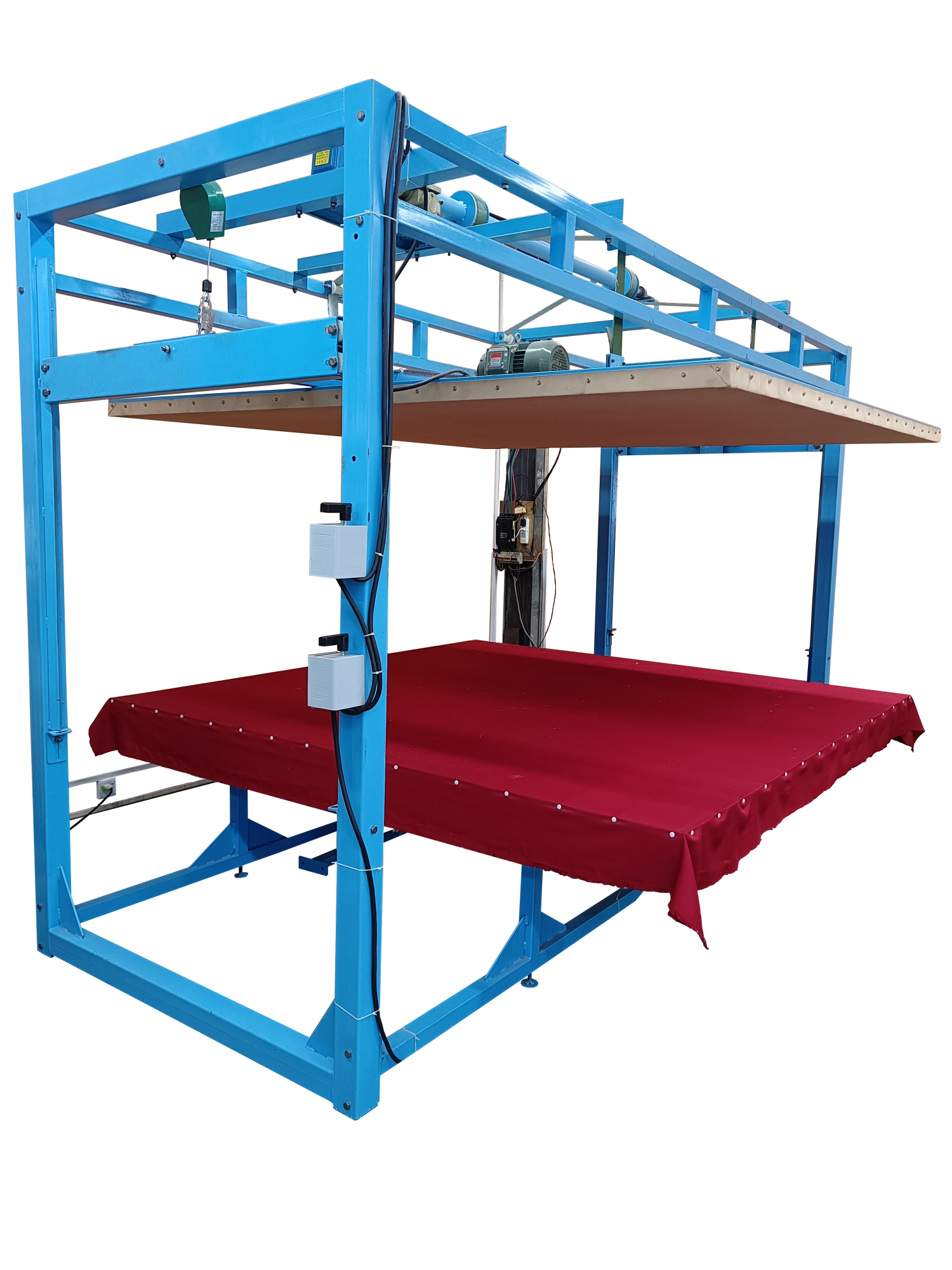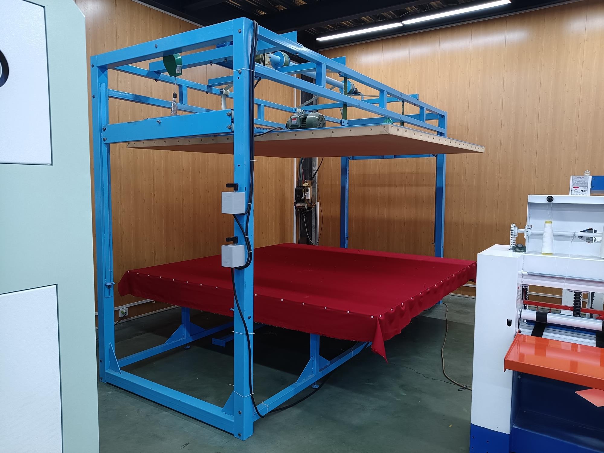 全自動揉棉機為徽星機械機械制造有限公司研發(fā)新型產(chǎn)品,該全自動揉棉機由傳統(tǒng)的上傳動方式,改為下傳動方式。上傳動全自動揉棉機的主要缺點是噪音高,振動副度比較大,安裝時要配合地錨來固定機器,本新型機器(全自動揉棉機)的下傳動裝置改變了以上的缺點。新一代全自動揉棉機揉磨機)操作方便,易于使用。適用于棉胎成型加工廠、踏花被廠、棉胎加工個體戶使用;全自動揉棉機揉制的棉胎(絮)平整、美觀、結(jié)實、耐用,全自動揉棉機(揉磨機)使傳統(tǒng)的人工強體力勞動變?yōu)楸鞠盗袡C器的自動化機械作業(yè),特別是自動升降系統(tǒng)和定時揉棉設定,大大減輕了工人的勞動強度、提高了勞動效率。并且一人可看管多機,效益非常顯著。全自動揉棉機其原理是電機帶動偏心運轉(zhuǎn)使上揉板運動,將棉鋪磨平、壓緊,使棉纖維與網(wǎng)線結(jié)合,成型棉胎。